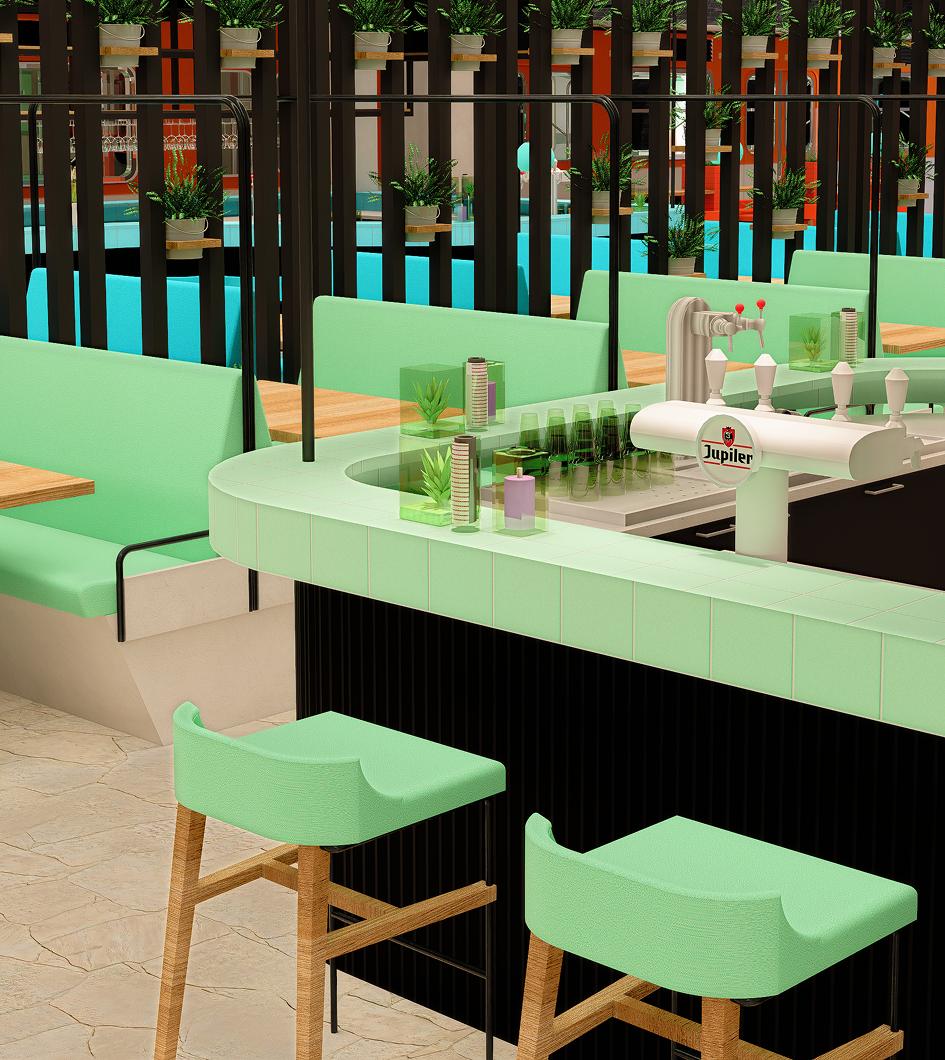 На станции restro расположены четыре ресторана с национальной кухней: яркая Италия в насыщенном красном, утончённая Франция в жёлтом, динамичная Америка в синем и минималистичная Япония в светло-зелёном.